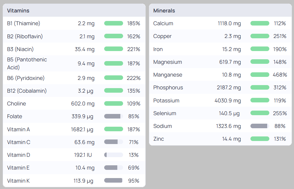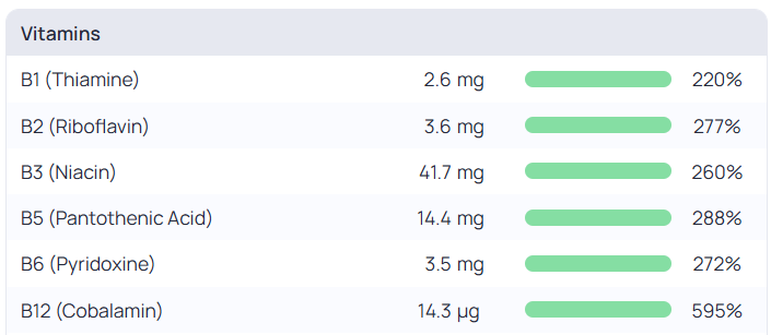 The free version of Cronometer provides a view of the Last 7 days, which aggregates data and shows where you are relative to the RDI. Below you can see I’m comfortably meeting the RDI for the B vitamins, and hovering it I’m able to see why that is. A few servings of chicken liver this week has provided me with 60% of my Vitamin B2, 53% of Vitamin B5 and 280% of Vitamin B12(!).