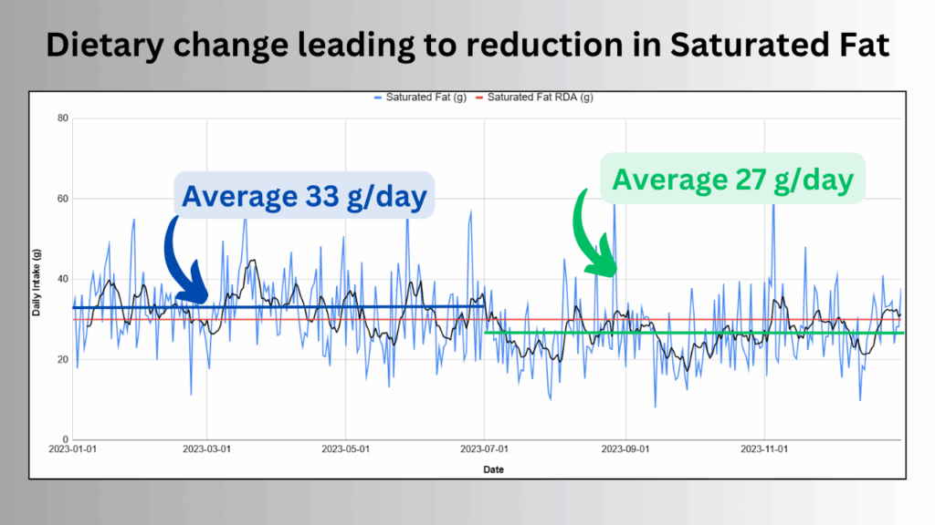 Personally I like to go a stage further, and I export the data to a Google Sheet and make graphs like this (annotated in Canva). Here I’ve plotted my daily saturated fat intake, added a rolling average in black, and the RDA of 30 grams as a red line. You can see that, prior to July 2023, I was 10% above the RDA, and since then I’ve been 10% below it.